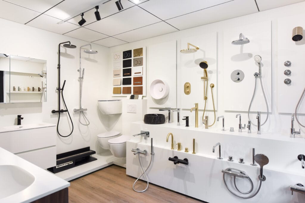 Volledig ingerichte badkamers tonen de nieuwste trends in sanitair, tegels en verlichting.