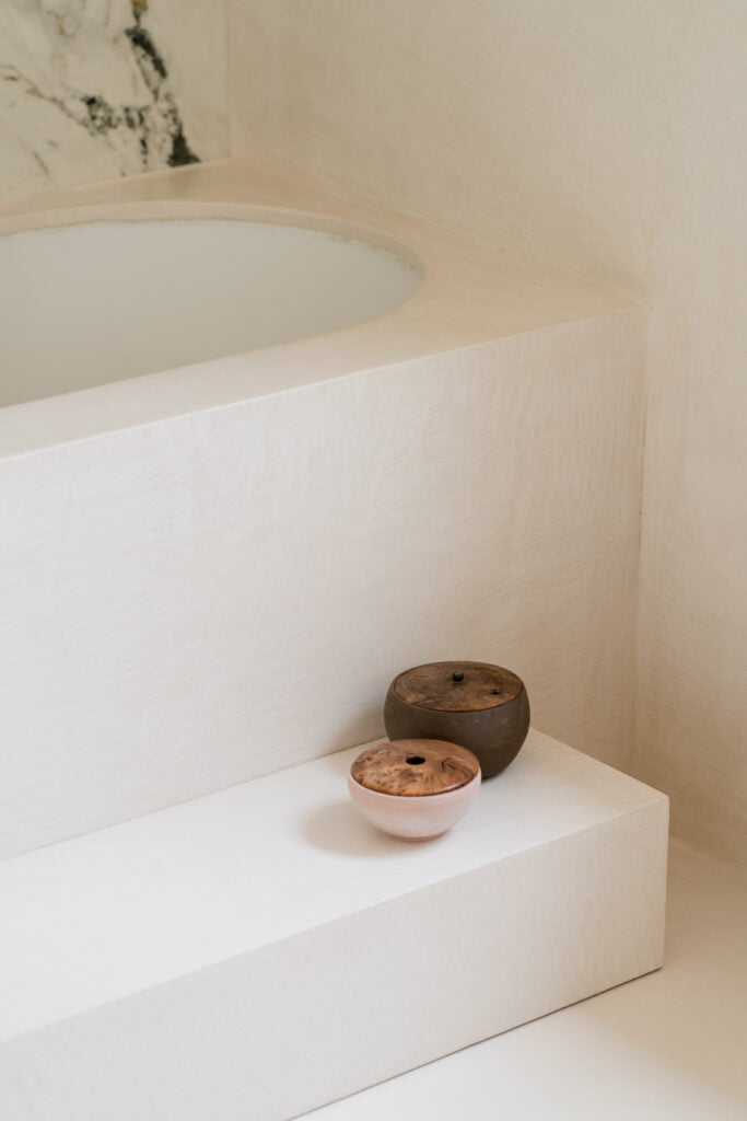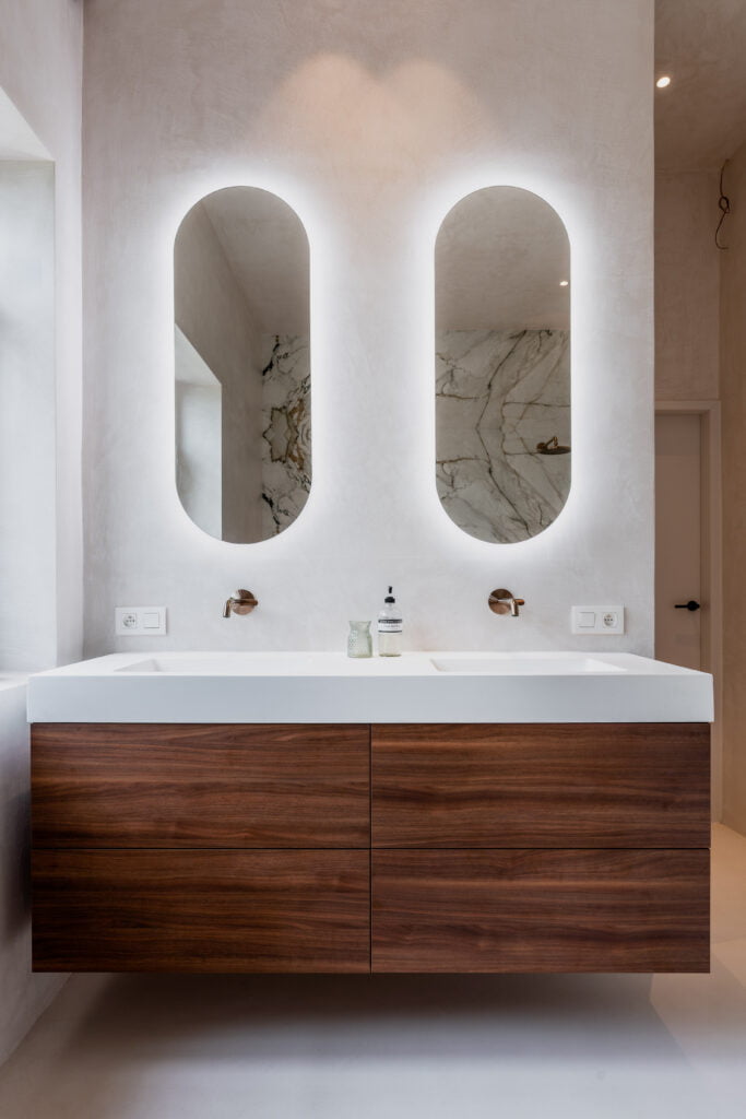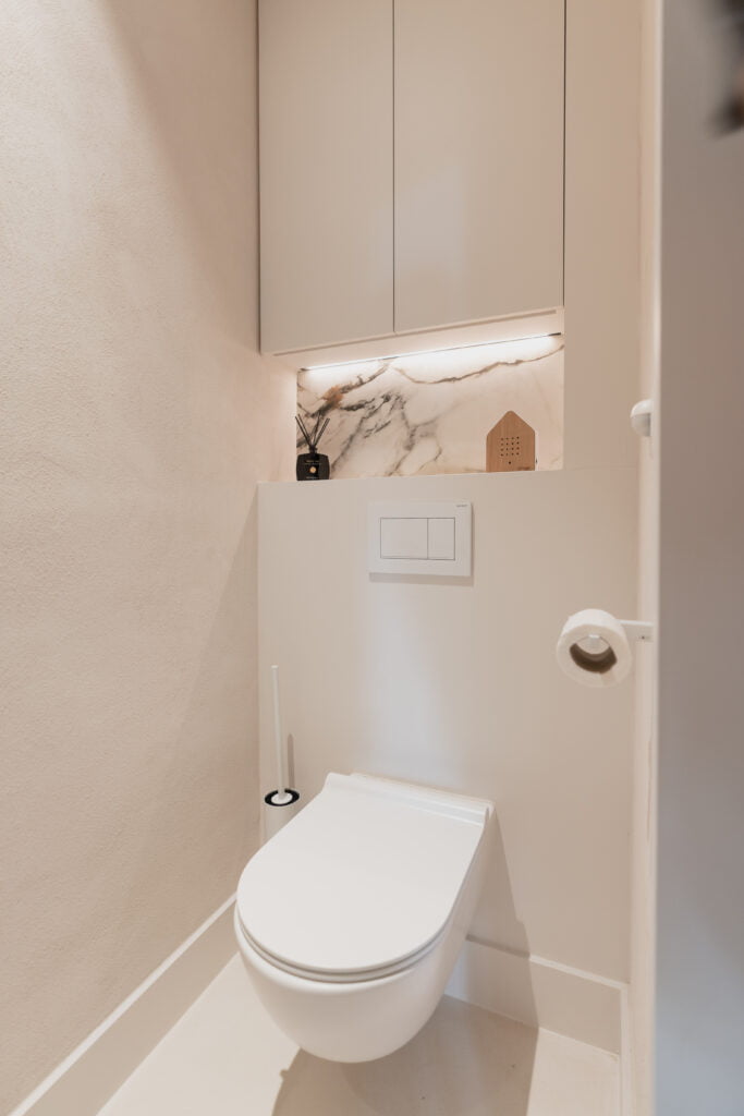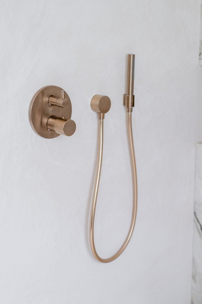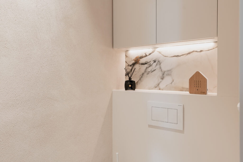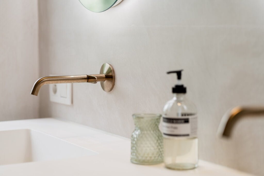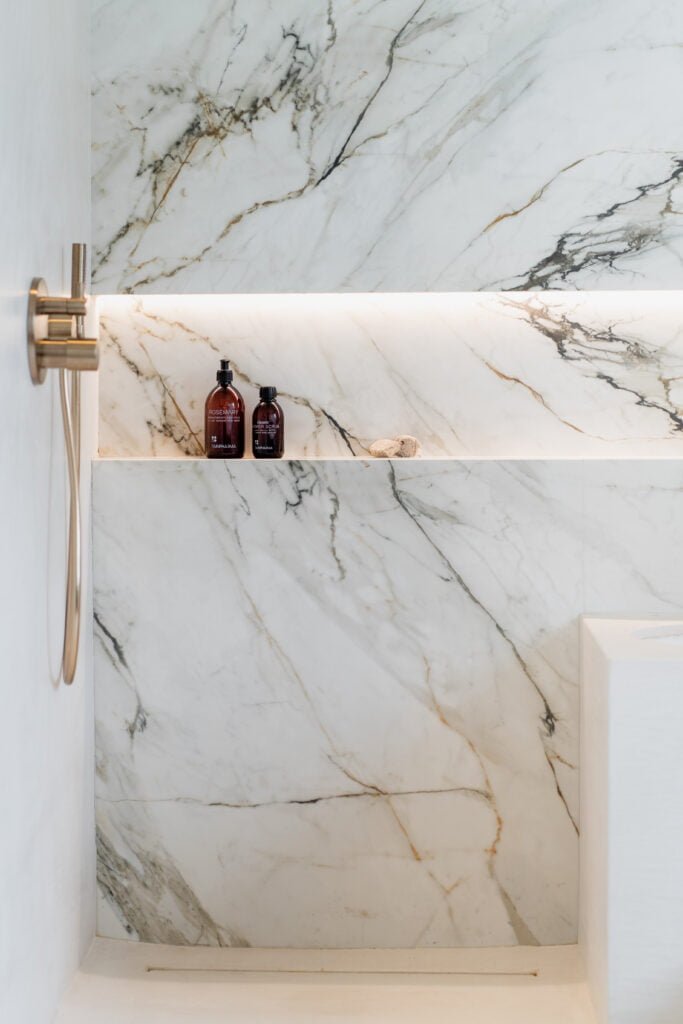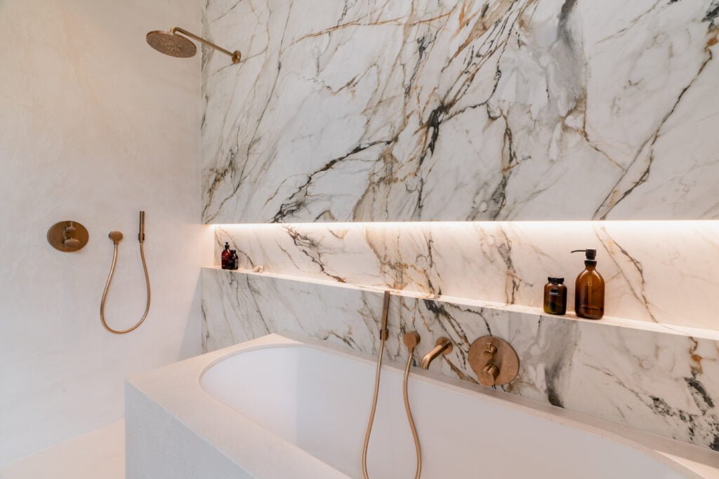 Deze wens hebben we verwerkt in de kranen en de marmeren wand met een inbouwnis.